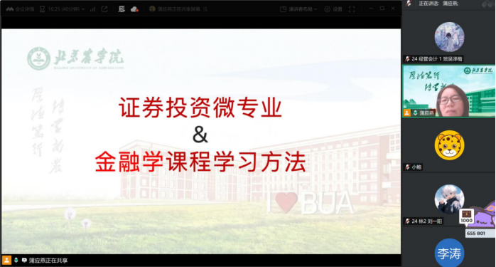 为帮助学生深入了解证券投资微专业的核心内容和教学安排、合理规划主修专业和微专业的学习时间、微专业课程学习方法等,9月20日,suncitygroup太阳新城经济系主任蒲应燕通过腾讯会议对微专业相关事宜进行了讲解和互动问答,全方位解读了专业优势和学习要点。
